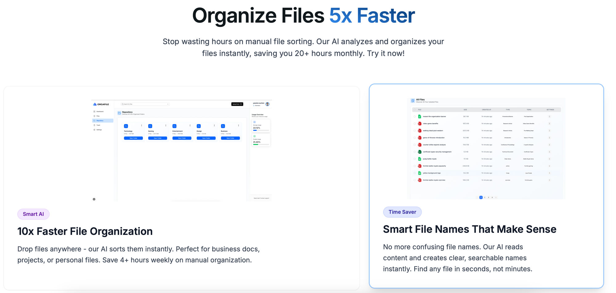 - Tổ chức nhanh chóng và hiệu quả: Bạn không cần phải dành hàng giờ để sắp xếp các tập tin thủ công. OrgaFile sẽ giúp bạn tiết kiệm ít nhất 20+ giờ mỗi tháng.
