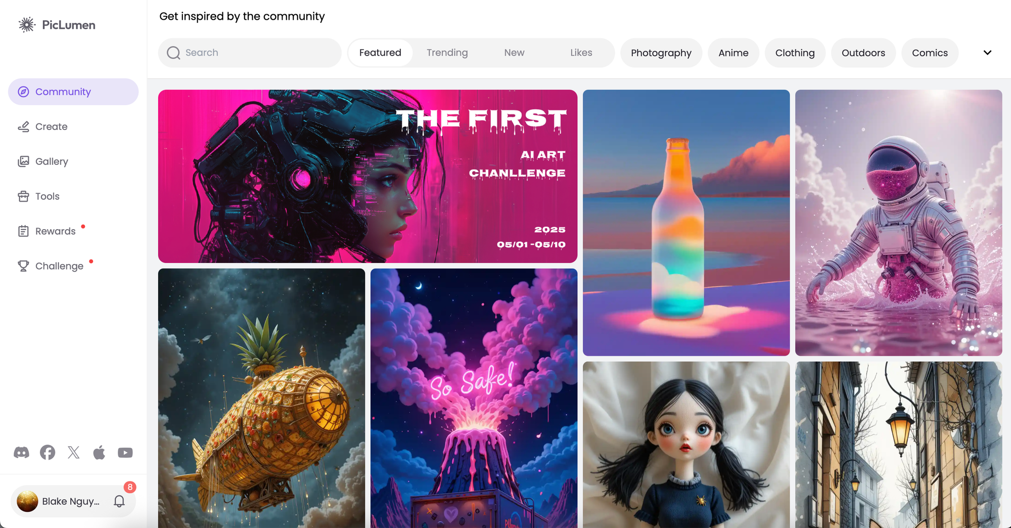 Sau khi đăng nhập, bạn sẽ được chuyển đến trang Community. Đây là nơi bạn có thể duyệt qua các hình ảnh được tạo bởi Piclumen AI. Nhấp vào một hình ảnh để xem chi tiết và prompt đã được sử dụng.