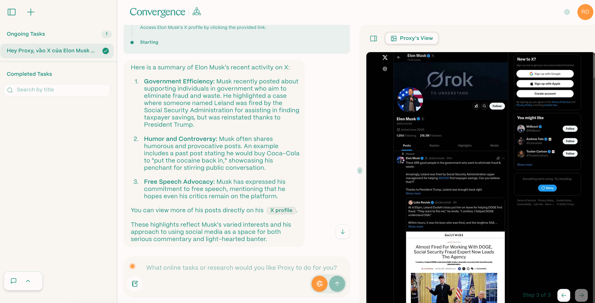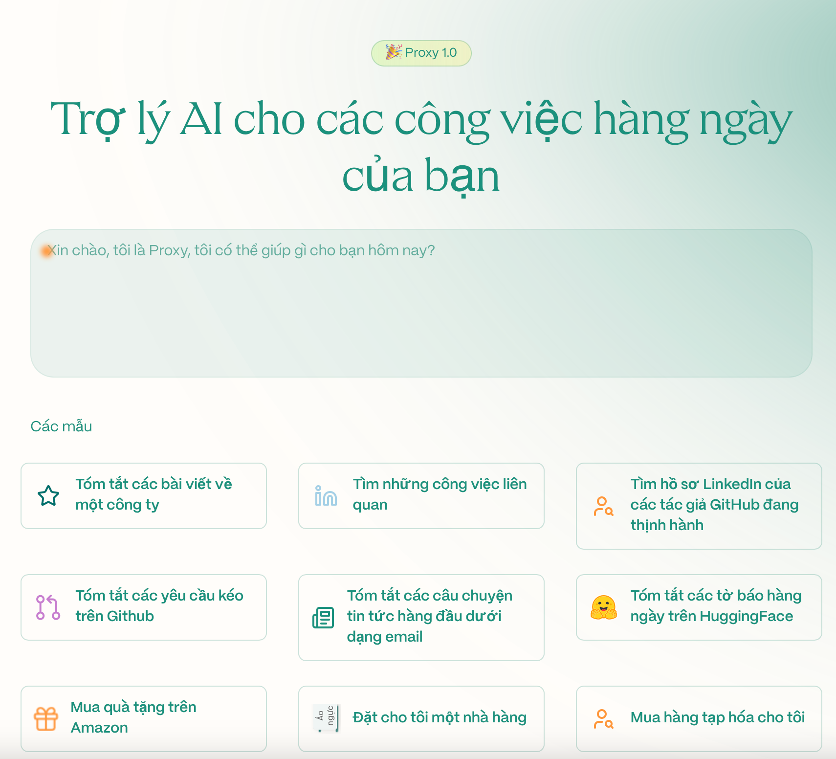 Proxy giúp bạn xử lý các nhiệm vụ lặp đi lặp lại như tổng hợp bài viết, tìm kiếm việc làm, tóm tắt pull requests trên GitHub, tóm lược tin tức hàng đầu và thậm chí là đặt chỗ nhà hàng – tất cả chỉ với vài câu lệnh tự nhiên.