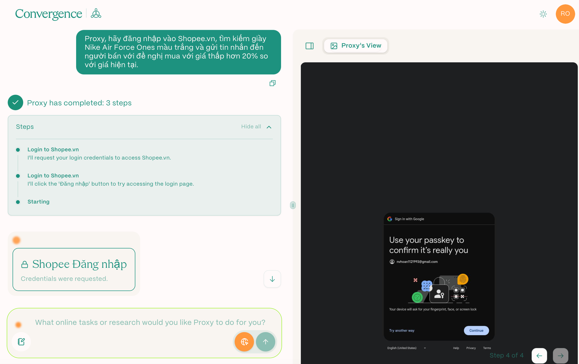 Hướng dẫn cách sử dụng Proxy AI để tự động tìm kiếm và thương lượng giá giày Nike Air Force Ones trên shopee.vn.