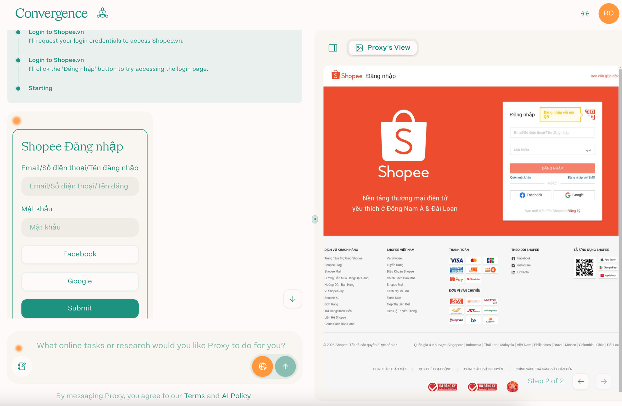 - Xác nhận Proxy đã nhận lệnh: Quan sát cửa sổ hiển thị quá trình Proxy thực hiện các bước như nhập email, mật khẩu và truy cập vào Shopee.vn và điền các thông tin mà Proxy yêu cầu
