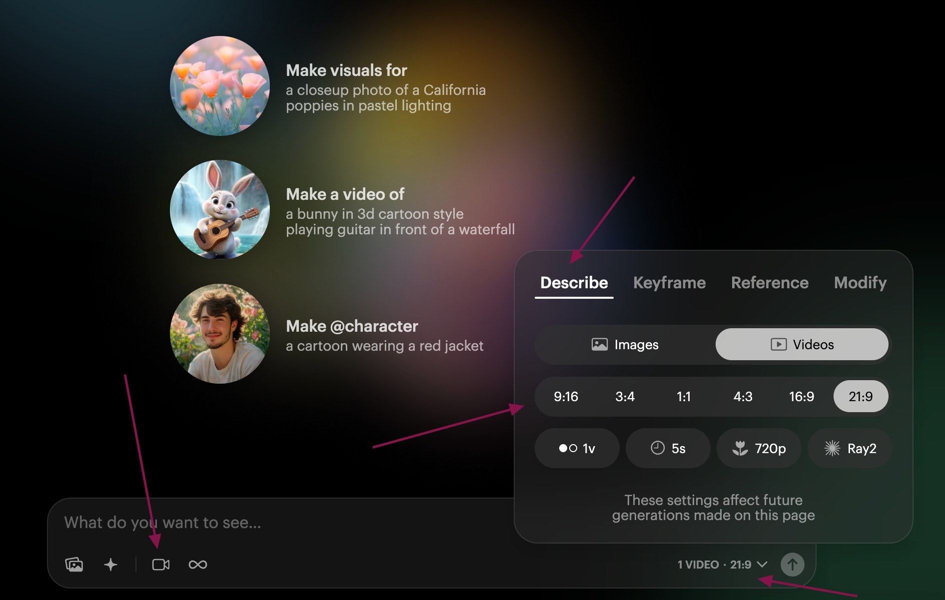 Để Reframe video, bạn chỉ cần Upload video muốn chỉnh sửa , sau đó tại tab "Describe" chọn tỉ lệ mà bạn muốn video sẽ có.