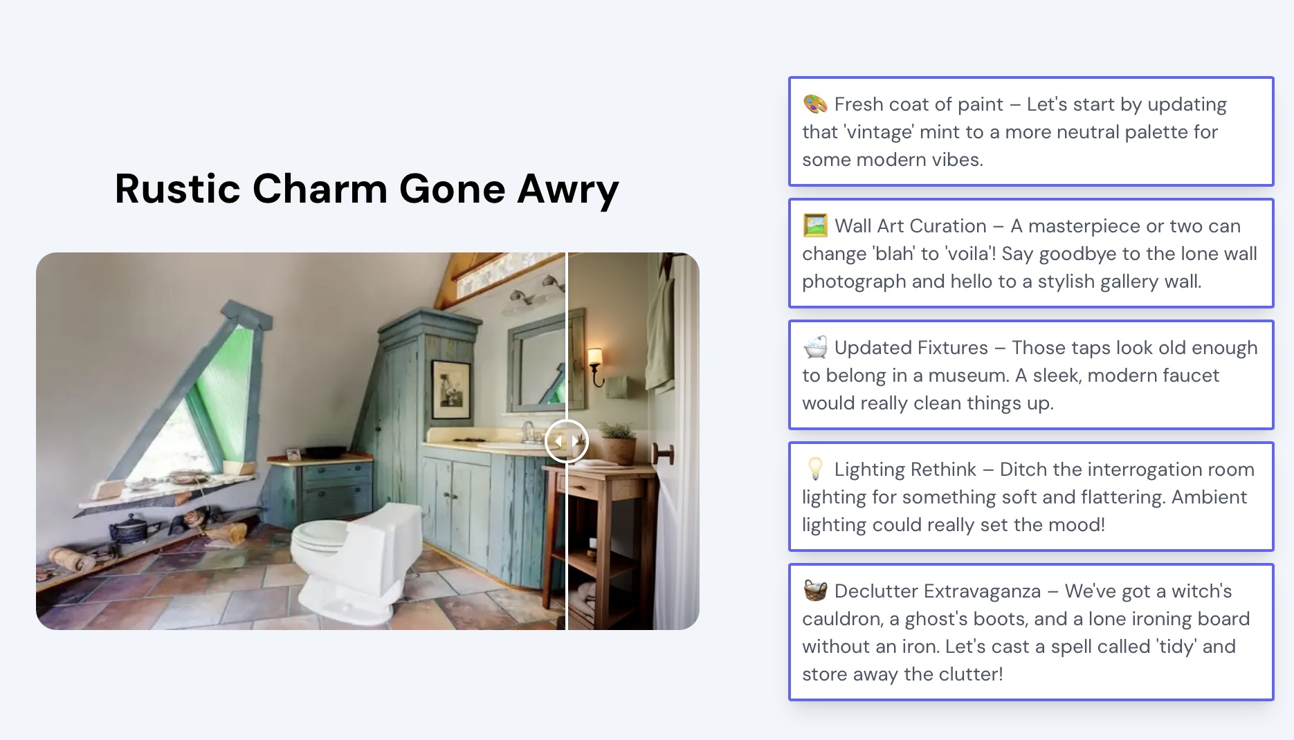 - Nhận tư vấn miễn phí từ AI: Trí tuệ nhân tạo của Roast My Room sẽ phân tích hình ảnh, đưa ra những điểm cần cải thiện và gợi ý các giải pháp thiết kế phù hợp với sở thích của bạn.