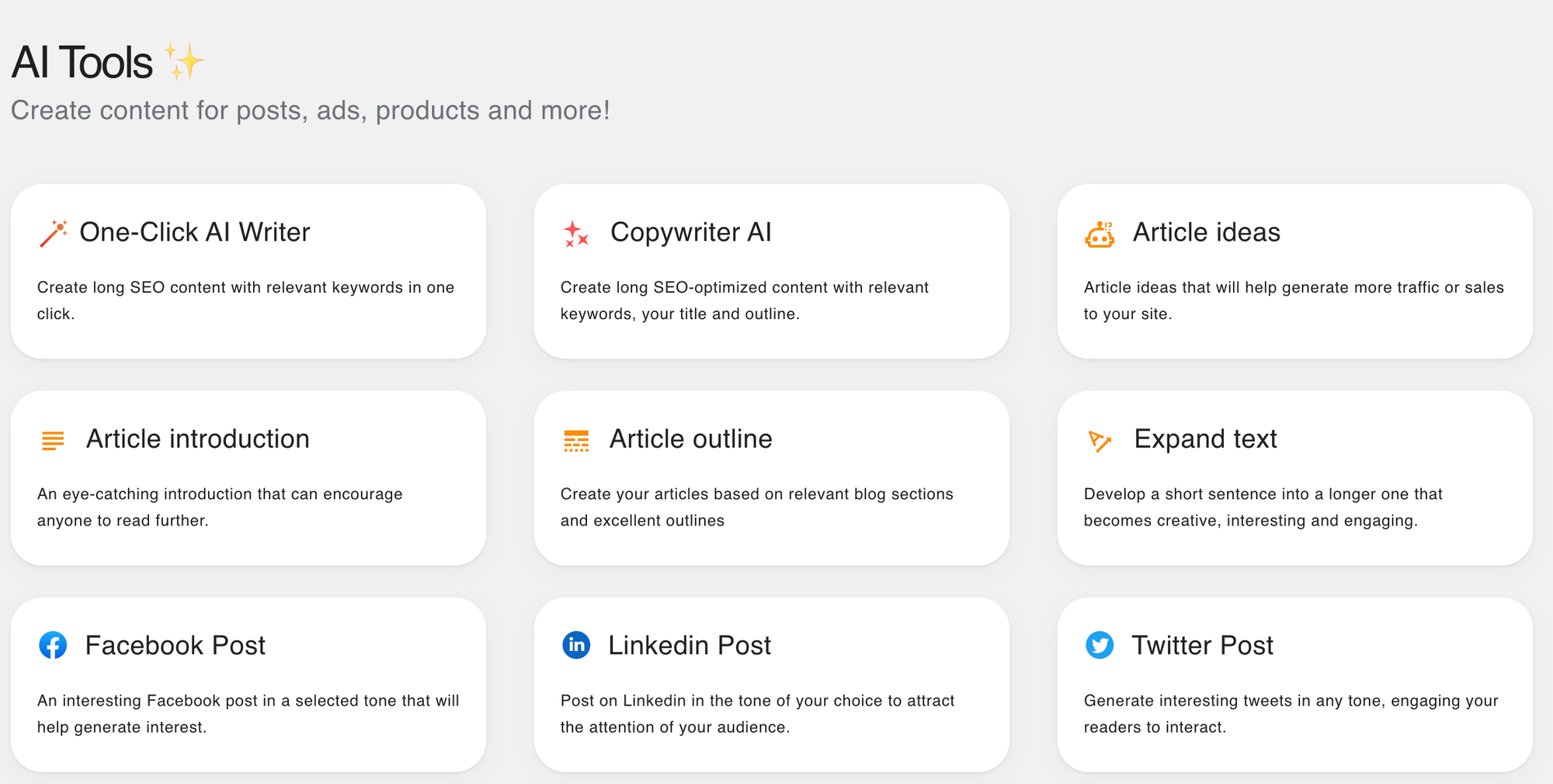 - Cung cấp nhiều công cụ khác nhau sử dụng trí tuệ nhân tạo (AI) để hỗ trợ SEO và content marketing, chẳng hạn như: