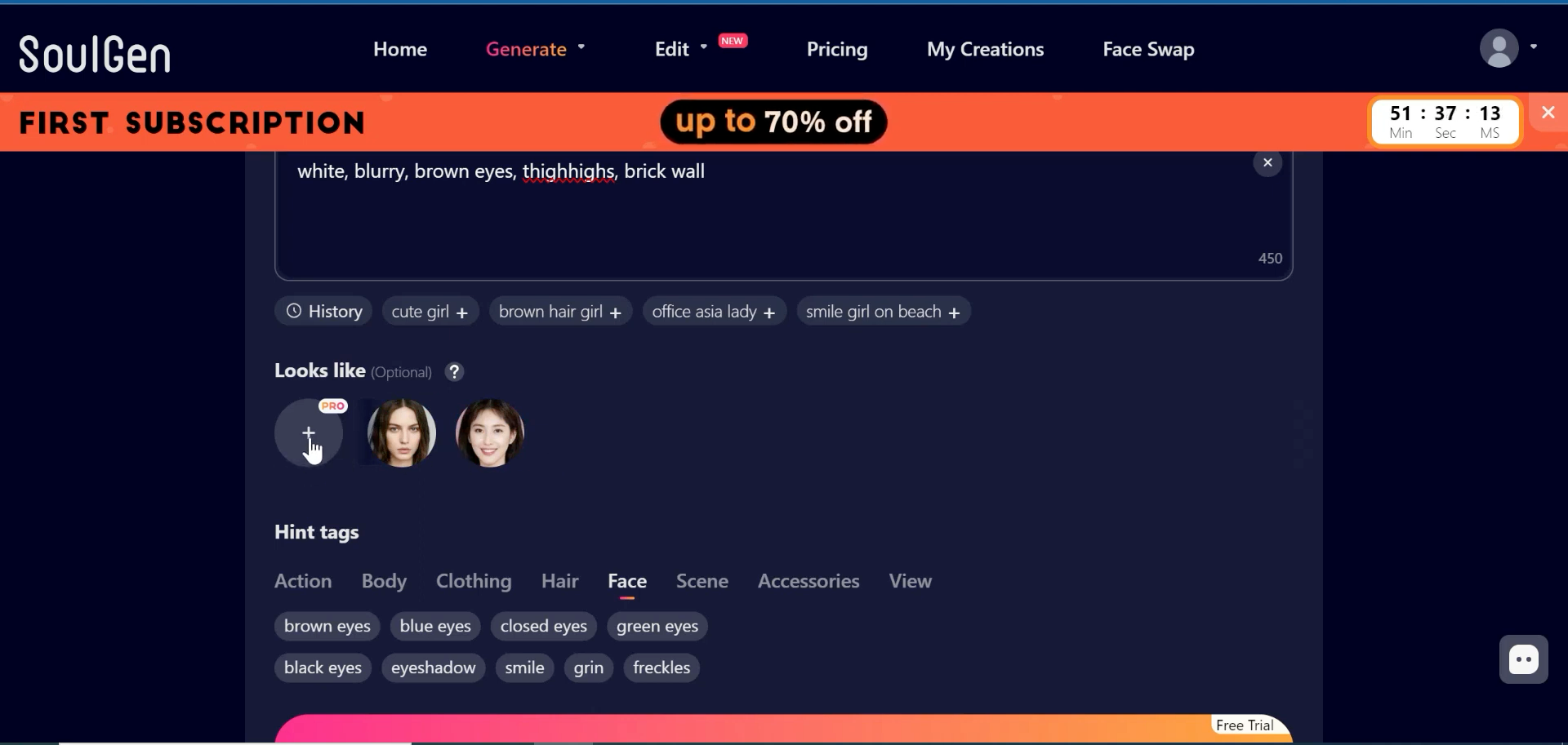 SoulGen AI image generator for stunning real/anime girl art from text. FREE trial for custom AI characters.