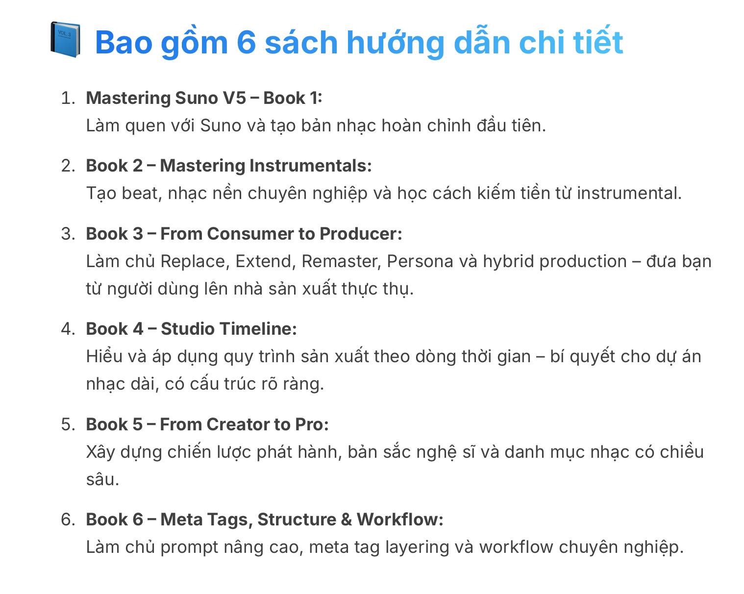 Để đọc tiếp 5 chương tiếp theo của tập 1 và các tập 2, 3, 4, 5, 6 hướng dẫn độc quyền để trở thành chuyên gia hàng đầu về làm nhạc AI trên Suno, các bạn vui lòng liên hệ zalo mình để đăng ký mua. Phí trọn bộ (400k), hoặc (100k cho mỗi tập).
