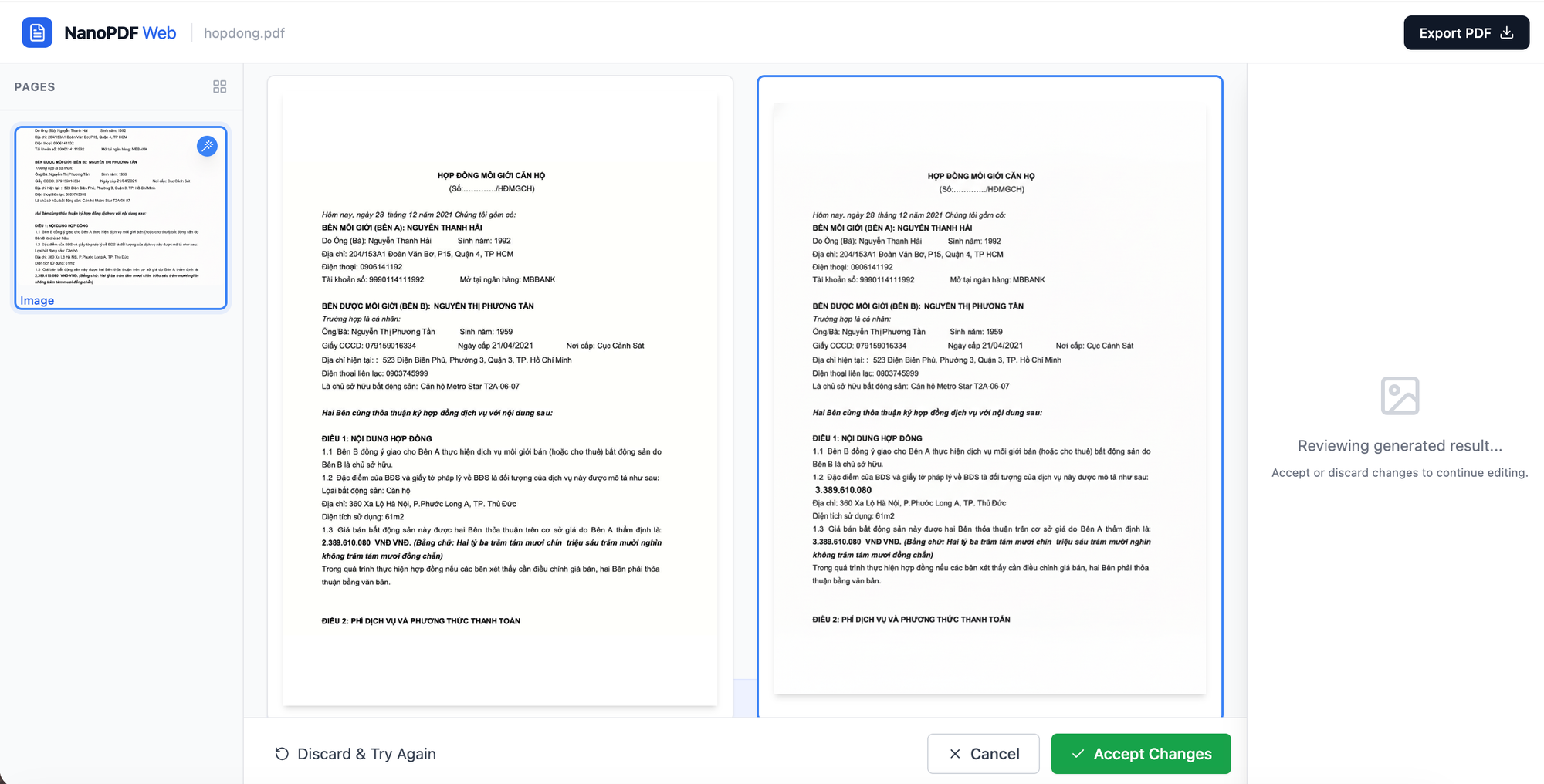 Đây là một công cụ chỉnh sửa tài liệu thế hệ mới, cho phép bạn sửa chữ, thay đổi số liệu, trực tiếp trên ảnh hoặc file PDF bằng AI, ngay trong trình duyệt. Không cần file thiết kế gốc, không cần Photoshop hay phần mềm PDF phức tạp – chỉ cần mô tả bằng ngôn ngữ tự nhiên.