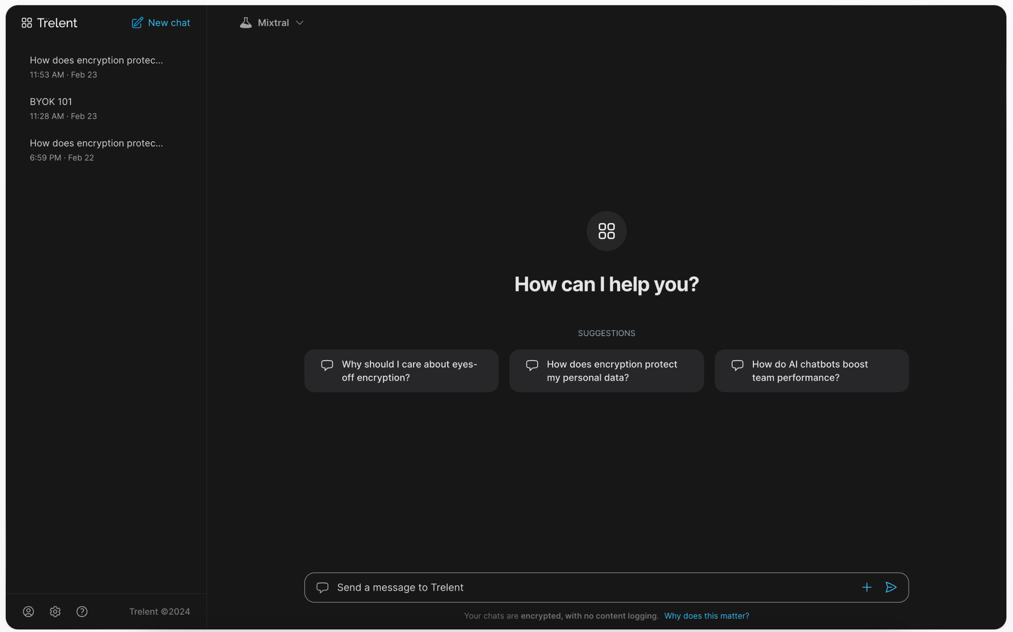 Trelent là trợ lý AI được mã hóa hoàn toàn, giúp các đội nhóm làm việc an toàn, hiệu quả. Dữ liệu của bạn sẽ luôn được bảo mật tuyệt đối, không bao giờ được gửi ra khỏi hệ thống của công ty.