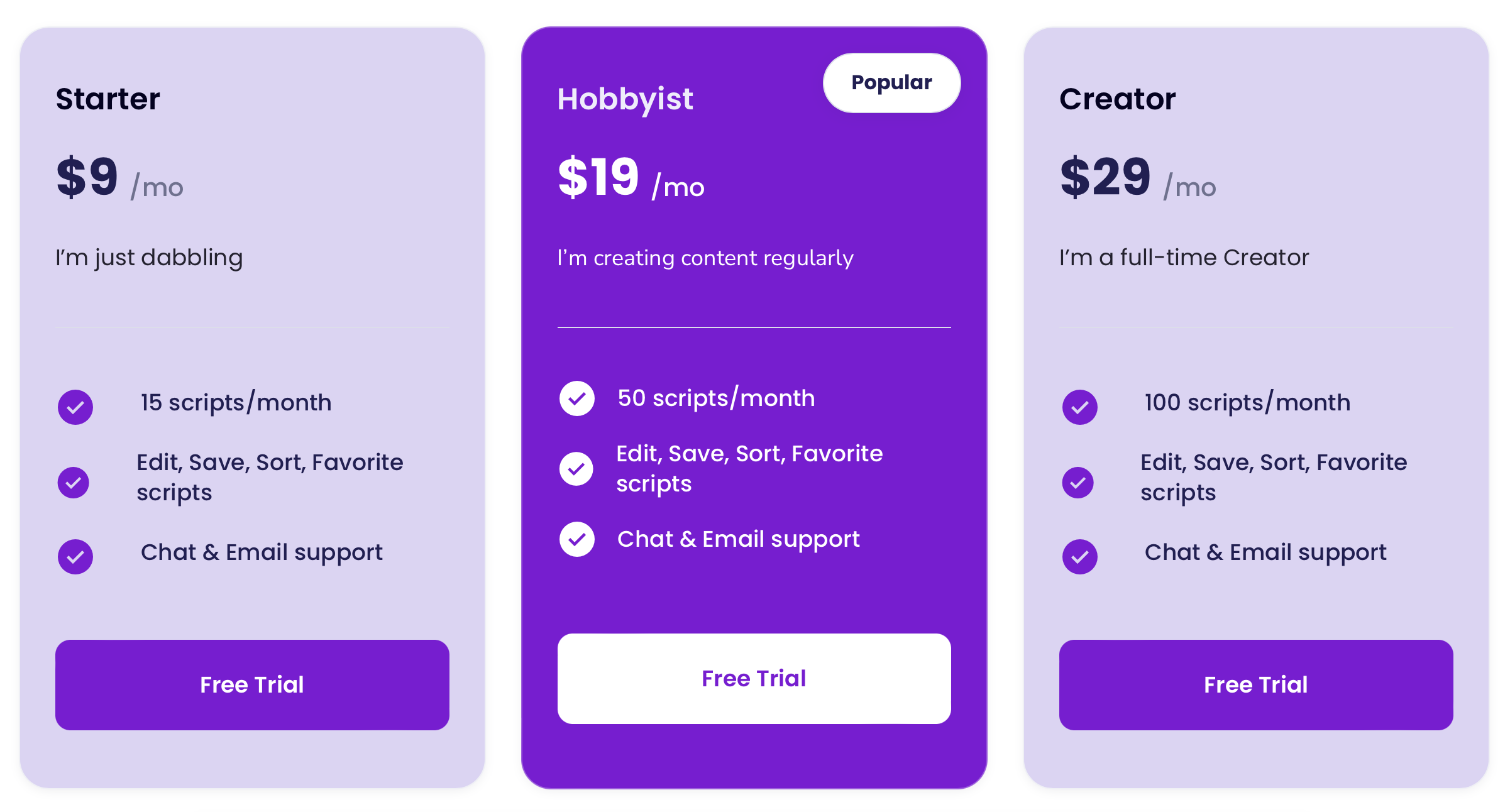 UGC Scripts cung cấp nhiều gói phù hợp với các cấp độ nhu cầu sáng tạo nội dung khác nhau. Để xem lại các gói và bắt đầu dùng thử 14 ngày, hãy truy cập Trang giá UGC Scripts.