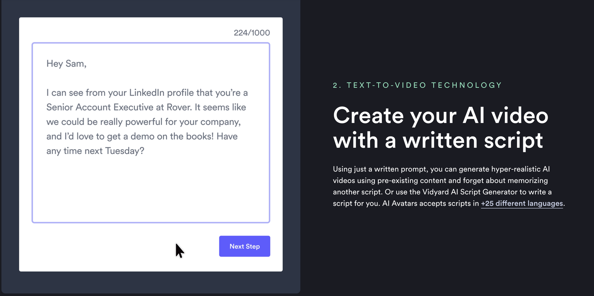 Giải pháp: Vidyard AI Avatars cung cấp một cách thức hoàn toàn mới để tạo hàng loạt "Vidyard Video Messages" (Tin nhắn video Vidyard) được cá nhân hóa. Nền tảng này tích hợp trí tuệ nhân tạo (AI) ngay bên trong, giúp bạn tận dụng sức mạnh của video để thu hút khách hàng tốt hơn so với văn bản thông thường.