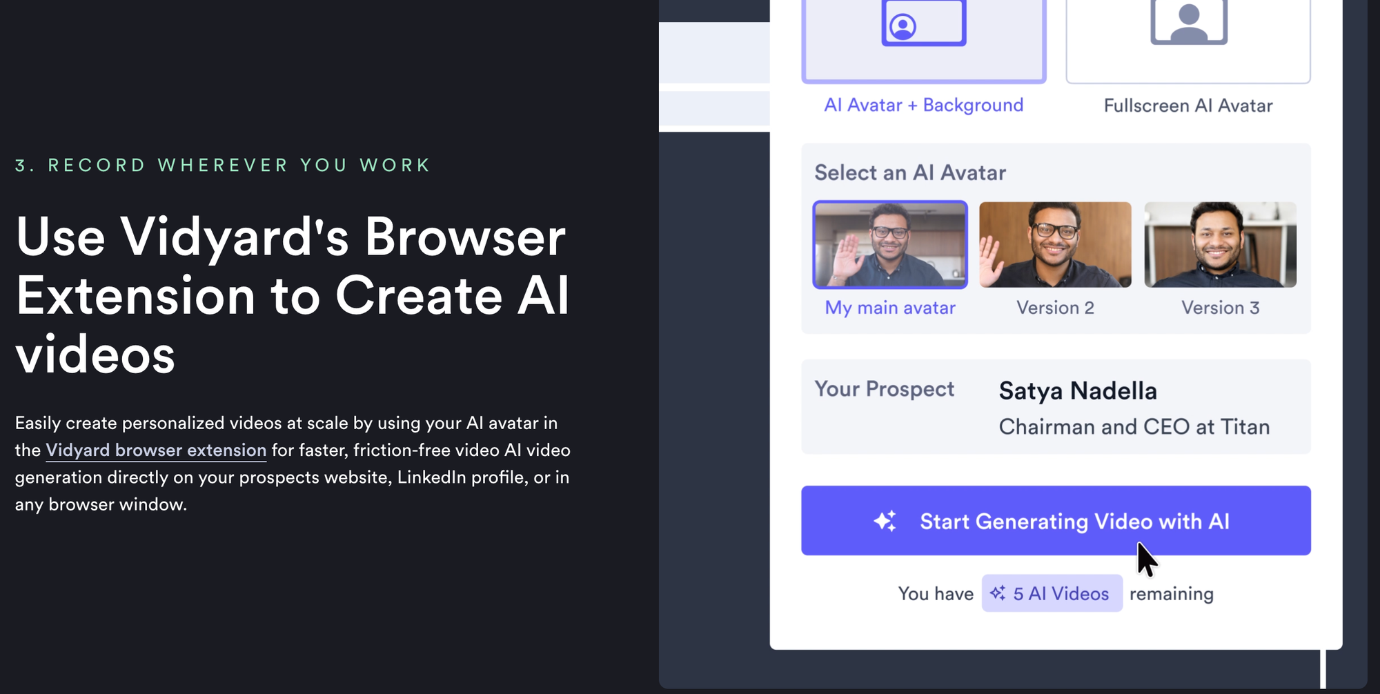 - Tạo video AI trong trình duyệt Vidyard: Sử dụng tiện ích mở rộng trình duyệt của Vidyard để tạo video AI từ bên trong trình duyệt của bạn, sau đó chia sẻ chúng với khách hàng tiềm năng và khách hàng. Đây là công cụ ghi màn hình tốt nhất để đạt được kết quả thực tế với video.