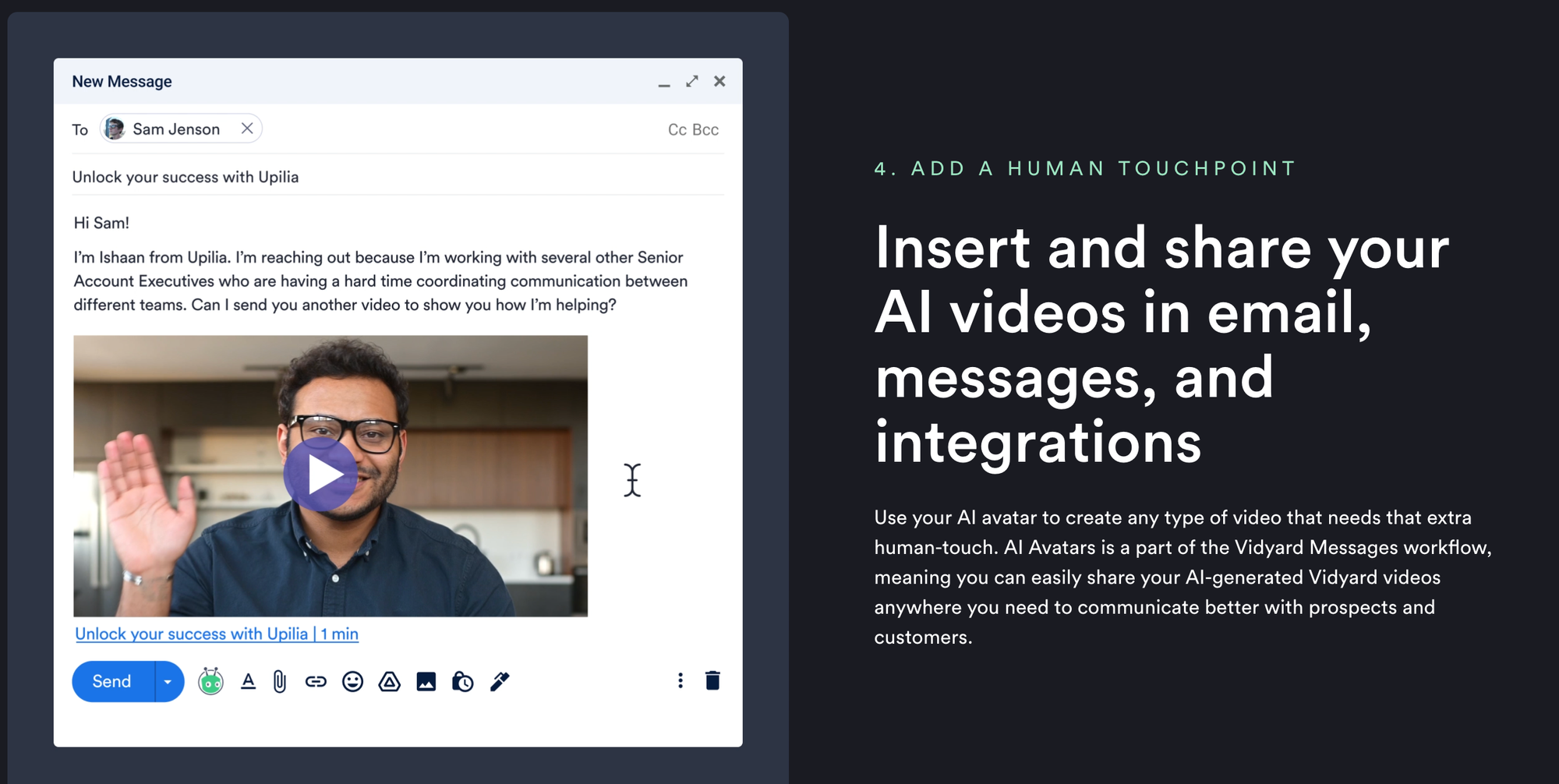 - Nền tảng xây dựng trên nền tảng Video Message quen thuộc: Vidyard AI Avatars là một cách hoàn toàn mới để tạo "Vidyard Video Messages" hàng loạt. Đây vẫn là nền tảng nhắn tin video được các đội ngũ bán hàng và marketing yêu thích, giờ đây được tích hợp thêm AI.