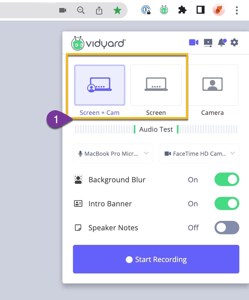 - Chọn biểu tượng tiện ích mở rộng Vidyard ở góc trên cùng bên phải trình duyệt của bạn.