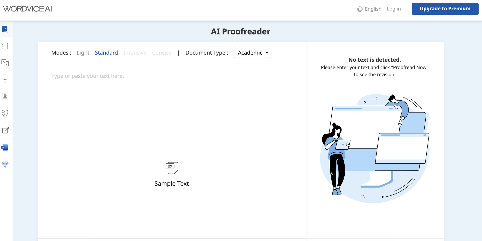 * **AI Proofreader:** Chọn chế độ "Light", "Standard", "Intensive" hoặc "Concise" tùy thuộc vào mức độ kiểm tra và chỉnh sửa mong muốn. Chọn loại văn bản phù hợp (tổng quát, học thuật, đơn xin việc, kinh doanh, sáng tạo hoặc văn bản web) để Wordvice AI tối ưu hóa quá trình kiểm tra.
