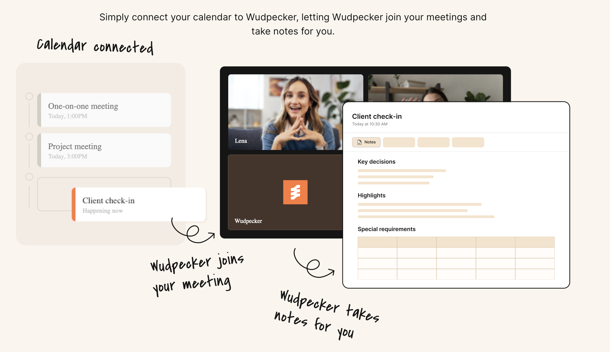Chỉ cần kết nối lịch làm việc của bạn với Wudpecker, trợ lý AI này sẽ tham gia tất cả các cuộc họp trực tuyến, tự động ghi chú theo yêu cầu và giúp bạn tiết kiệm thời gian, nâng cao hiệu suất làm việc.